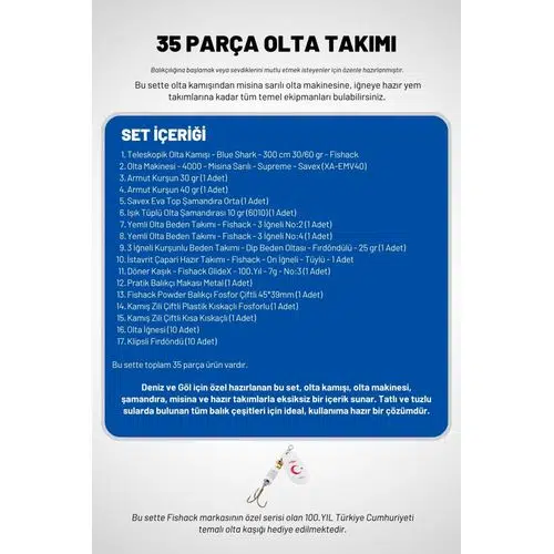 Deniz ve göl için özel hazırlanan bu 35 parçalık olta seti; olta kamışı, olta makinesi, şamandıra, misina ve hazır takımlarla eksiksiz bir içerik sunar. Tatlı ve tuzlu sularda bulunan pek çok balık türü için ideal, kullanıma hazır bir çözümdür.