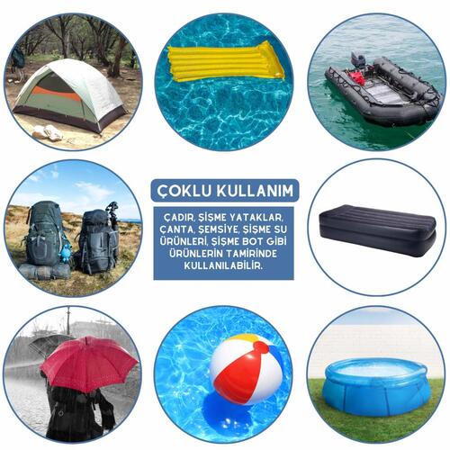 Bu yüksek kaliteli tamir seti, çadırlarınızdan şişme botlara, şişme yataklardan oyuncaklara, ceketlerden şemsiyelere ve sırt çantalarına