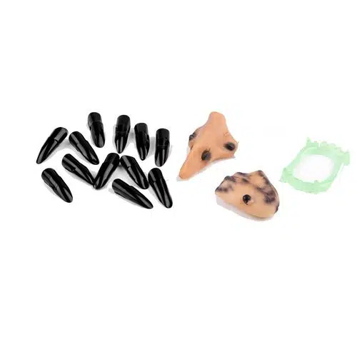 Set içerisinde yer alan fosforlu takma diş, loş ortamlarda öne çıkarken; cadı burnu ve çenesi klasik cadı karakterini tamamlar. Siyah plastik cadı tırnakları ise kostümünüze korkutucu ve etkileyici bir detay katar.