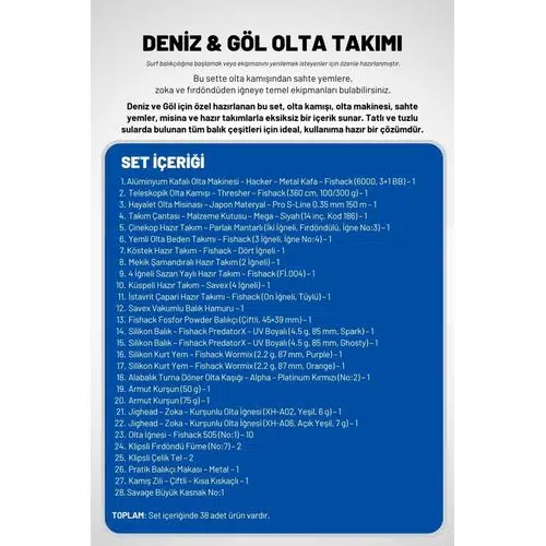 Deniz ve göl avcılığı için özel olarak hazırlanmış bu 38 parçalık profesyonel olta seti, kamış ve makineden yemlere, hazır takımlardan aksesuarlarına kadar eksiksiz bir balıkçılık deneyimi sunar. Hem yeni başlayanlar hem de deneyimli balıkçılar için ideal olan bu set, kıyı balıkçılığı, göl avcılığı ve surf balıkçılığı için de kullanılabilir.