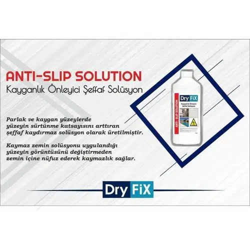DRYFİX Anti-Slip Solution; şeffaf ve Kaydırmaz Solüsyon; parlak ve kaygan yüzeylerde yüzeyin sürtünme katsayısını arttıran şeffaf kaydırmaz solüsyon olarak üretilmiştir.