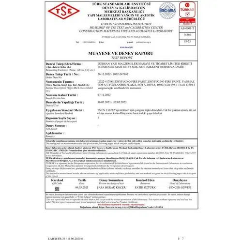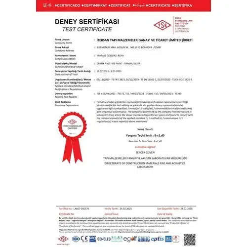 Yanmaz boyaların performansı, uluslararası akreditasyona sahip laboratuvarlarda yapılan testlerle ve uluslararası standartlara göre ölçülür. Bu testlerde, yangına dayanıklılık süresi (örneğin R15, R30, R60, R90, R120) ve yangına tepki sınıfı (A1, A2, B, C, D, E gibi) gibi performans kriterleri değerlendirilir. Bu yönetmelikler ve standartlara uygun yanmaz boya kullanımı, binaların yangın güvenliği açısından önemlidir. Alevin yayılmasını önleyerek, yangının kontrol altına alınmasını sağlamaktadır. Binaların yangın sırasında güvenli bir şekilde tahliye edilmesi için zaman kazandırmaktadır.