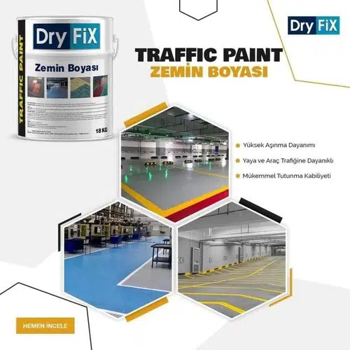 Zeminler özel olarak üretilen boyalar ile boyanır. Bu boyaların su geçirmez, UV ışınlarına dayanıklı, çizilmelere ve darbelere karşı dayanıklı, toz ve kirlerden etkilenmeyen özel formülü bulunuyor. Dryfix Trrafic Paint her türlü zemin yüzeye uygulanarak tam koruma sağlar. Boyama ve işaretlemeler yapmak için özel olarak üretilen Traffic Paint zemin boyası, özel formülü ile yüzeye yapışarak uzun süre dayanıklı kalır.