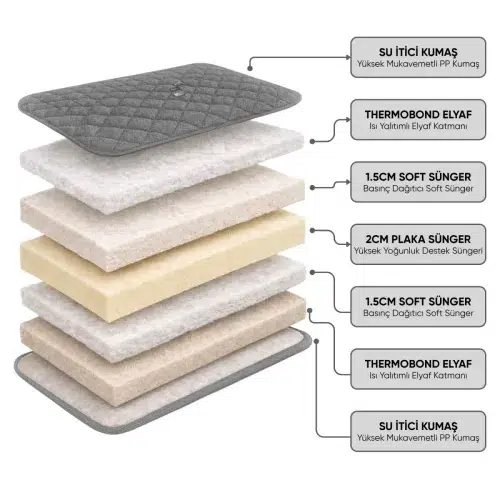 Kamp yatağının iç yapısı, konfor ve dayanıklılığı birlikte sağlayacak şekilde çok katmanlı olarak tasarlanmıştır. Thermobond elyaf katmanının altında yer alan 1,5 cm soft sünger, 2 cm plaka sünger ve tekrar soft sünger katmanları toplamda 6 cm kalınlık oluşturur. Bu yapı vücut ağırlığını dengeli şekilde dağıtarak sert zeminlerde daha rahat bir yatış yüzeyi sunar.