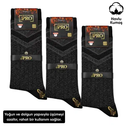Havlu Erkek Soket Çorap 3’lü set, soğuk hava koşullarında ayağı sıcak tutmak ve uzun süreli konfor sağlamak amacıyla tasarlanmıştır. Tamamen havlu dokulu iç astarı sayesinde yoğun pamuk yapısı ayağı sarar ve ısı yalıtımı oluşturur. Özellikle kışlık havlu iç astarlı erkek termal soket çorap 40-45 arayan kullanıcılar için hem günlük kullanım hem de açık alan aktivitelerinde güvenilir bir seçenektir.