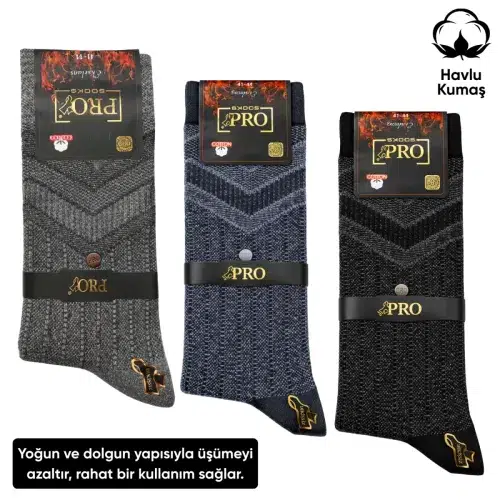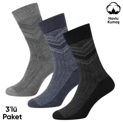 Havlu Erkek Soket Çorap 3’lü set, soğuk hava koşullarında ayağı sıcak tutmak ve uzun süreli konfor sağlamak amacıyla tasarlanmıştır. Tamamen havlu dokulu iç astarı sayesinde yoğun pamuk yapısı ayağı sarar ve ısı yalıtımı oluşturur. Özellikle kışlık havlu iç astarlı erkek termal soket çorap 40-45 arayan kullanıcılar için hem günlük kullanım hem de açık alan aktivitelerinde güvenilir bir seçenektir.