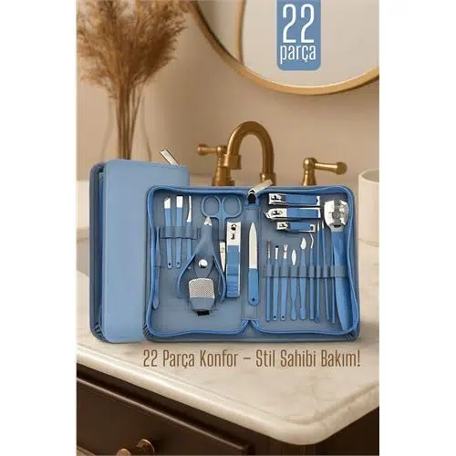 Bu 22 parçalık mavi manikür-pedikür seti, evde profesyonel bakım yapmak isteyenler için ideal. Hem tırnak hem cilt bakımı için gerekli tüm araçlar tek bir şık çantada.