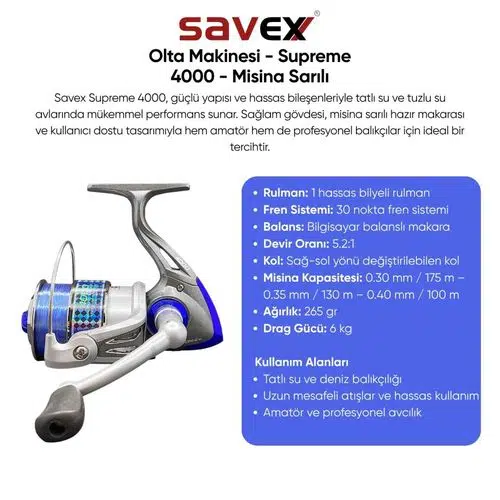 Balık avına hazır set! Savex Supreme 4000 olta makinesi, Protackle Azur 3.00m teleskopik olta kamışı ve Fishack omuz askılı taşıma çantası bir araya gelerek hem amatör hem de profesyonel balıkçılar için eksiksiz bir çözüm sunar. Tatlı su ve deniz avlarında yüksek performans, sağlam yapı ve pratik kullanım arayanlar için mükemmel bir kombinasyondur.