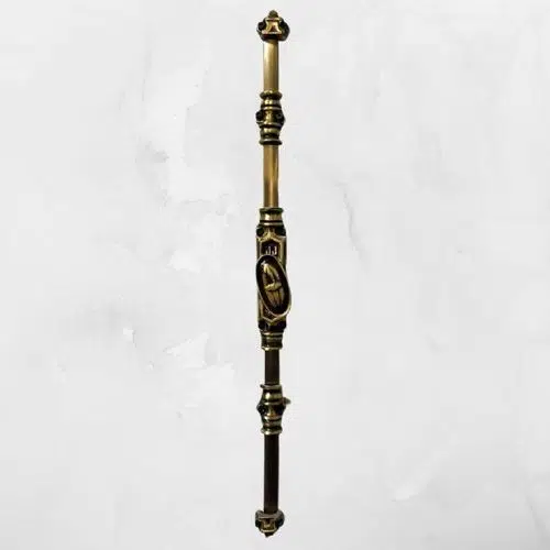 PRİNÇ DÖKÜM ESKİTME ANTİK SARI (RUSTİK, FERFORJE TİPİ) OSMANLI TİPİ ÇİFT KANAT PENCERE İÇİN ÜSTTEN TAKMA BORULU MANDAL SAPI (PENCERE KOLU) ( 1 takım )