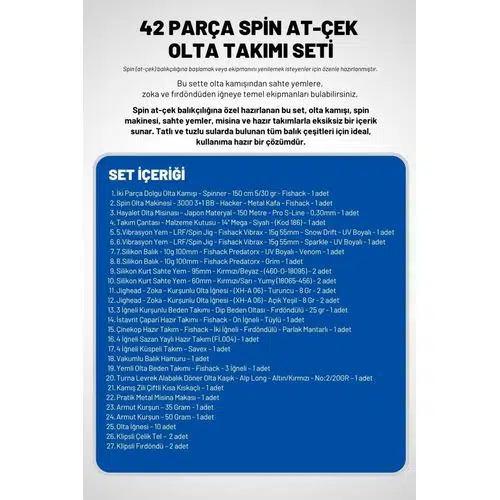 Spin avcılığına özel hazırlanan bu set; olta kamışı, spin makinesi, misina, silikon yemler, jighead çeşitleri ve hazır takımlarla geniş bir balık yelpazesine uygundur. Kolay taşınabilir yapısıyla hem kıyı hem tekne avlarında hızlı kurulum sağlar.